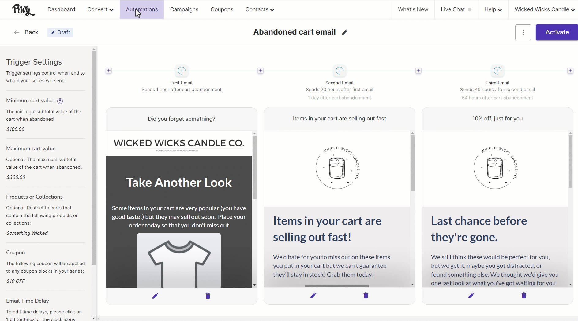 Once you’ve customized your templates and edited your settings, you’re ready to launch your Abandoned Cart Series! Click the Activate button in the upper right corner of your series.
