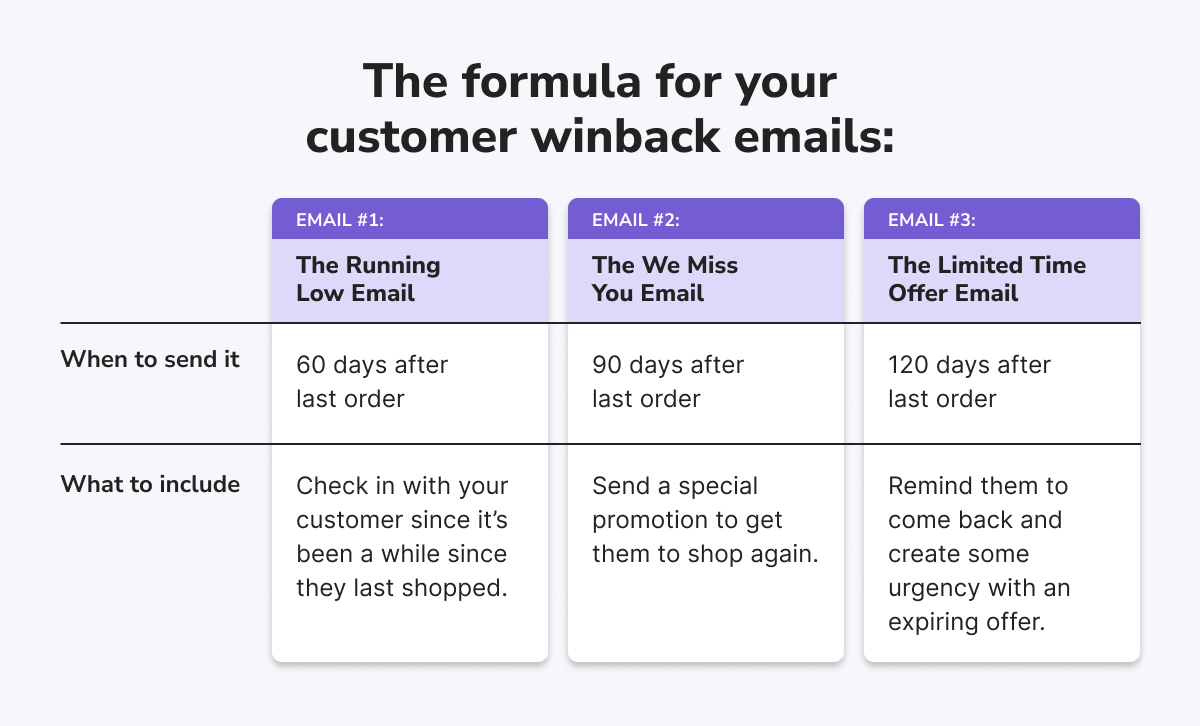 Did you know that repeat customers created as a result of your actions are 9x more likely to convert, spend 3x your average order value, and are 20% more profitable for your business? That is why customer retention is so important and having an active Customer Winback series is crucial. A good Customer Winback series: Makes your customer feel noticed and appreciated by using their first name. Creates urgency around an incentive to use on their next order. Is positive and friendly (i.e., “We missed you!”), rather than a sales pitch or guilt trip.Examples