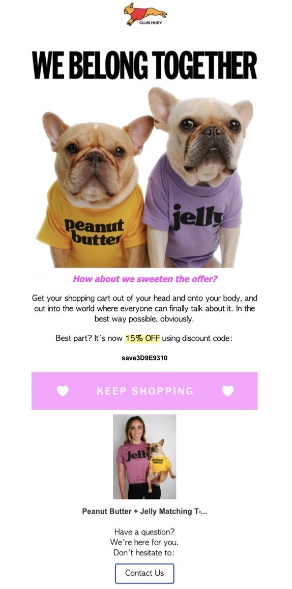 Club Huey does a great job of this on their abandoned cart emails, which includes an incentive to bring them back to their cart. They also show the customer the item that they left behind in their cart, alongside a clear call-to-action:
