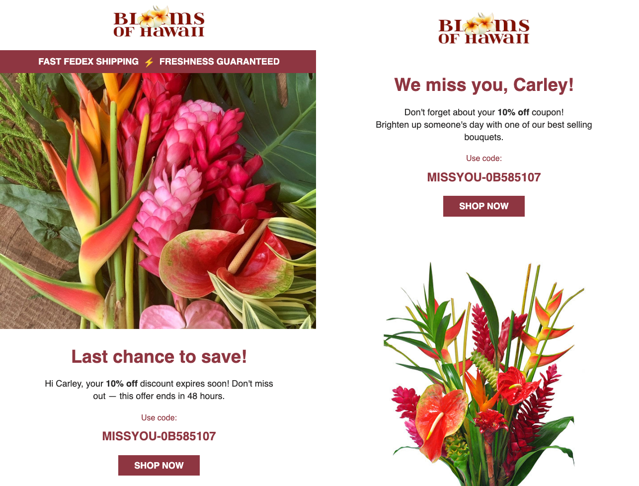 Blooms of Hawaii uses a friendly subject line, addresses their customer by their first time, and reminds them of their limited-time incentive in their Winback Series:
