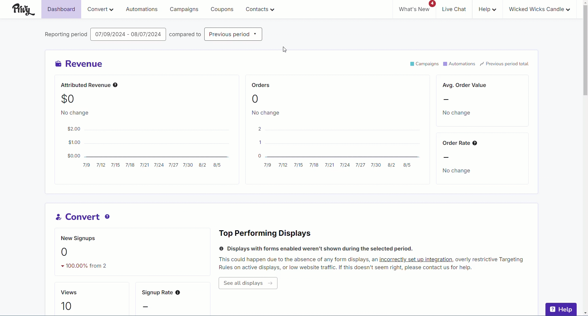 This email provides insight into the views, signups, orders, and revenue generated by your active displays. It is sent each Monday morning.