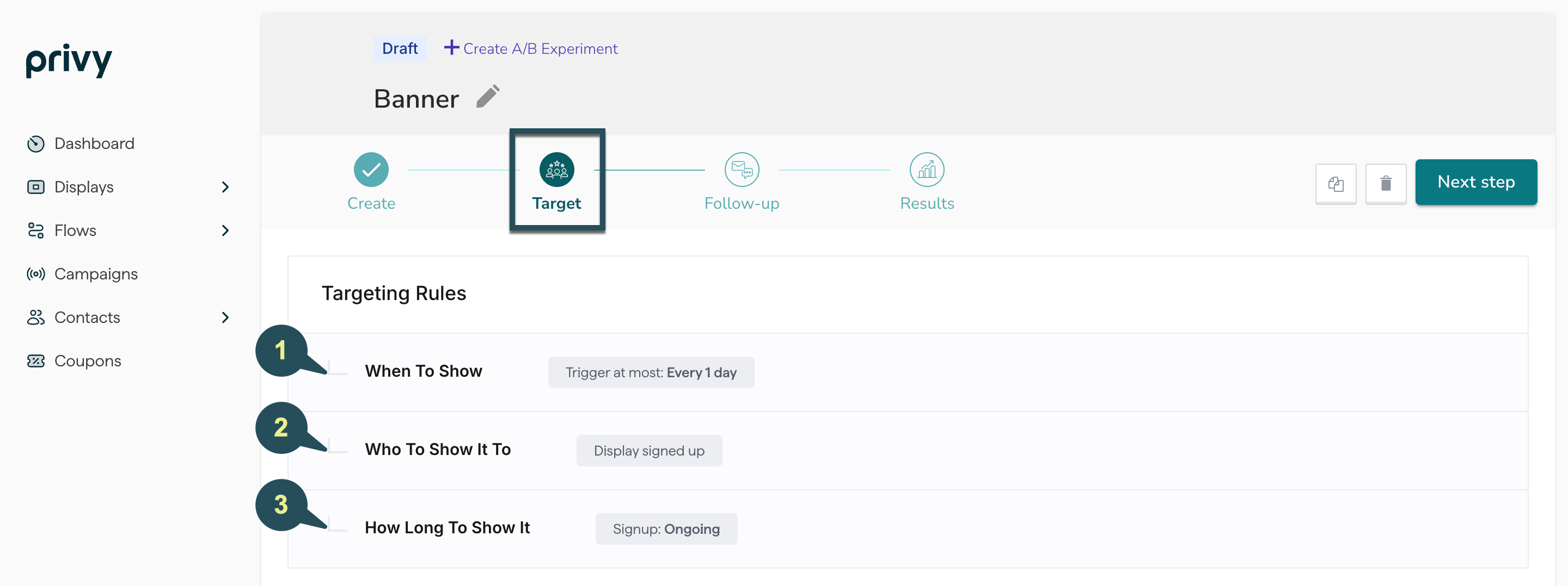 To customize your Banner’s settings and audience targeting, navigate to the Target step of the builder: