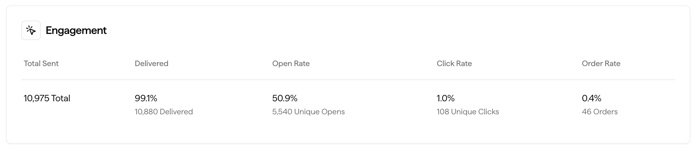 The total number of emails sent in your campaign, along with a breakdown of the percentage delivered, opened, clicked, and ordered based on the number of recipients.