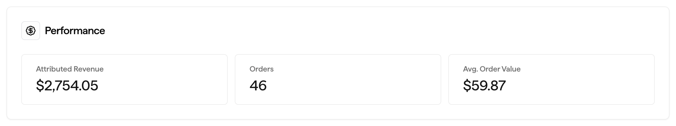 The total revenue and orders attributed to your campaign, along with the campaign’s average order value.