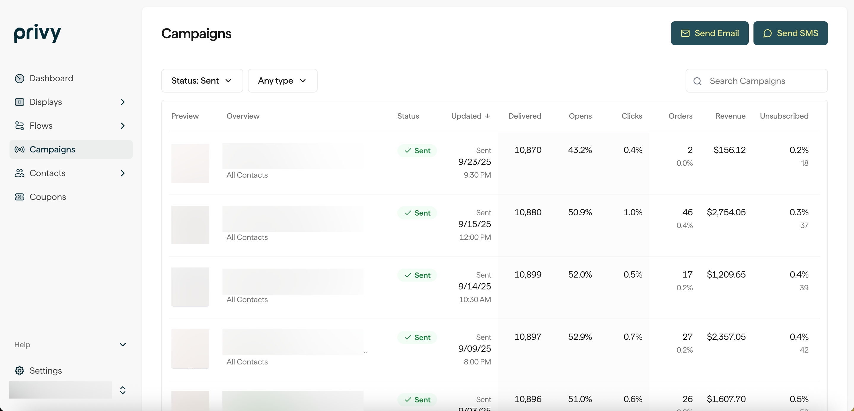 To drill down into an individual campaign’s metrics:- Head to your Campaigns page.