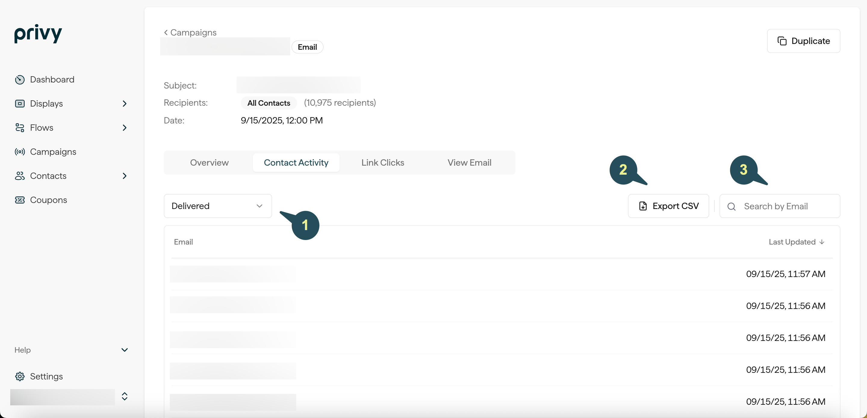 Your Contact Activity tab provides you with a full list of your campaign’s recipients. You have the capability to search for recipients’ email addresses, export a CSV report of your recipients, and/or filter this list by deliverability, engagement activity, unsubscribes, or rejected contacts.