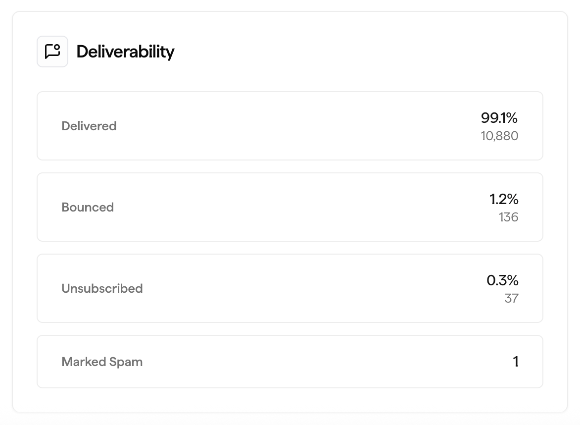 The number of emails delivered out of the numbers sent, along with insights into your bounce rate, unsubscribed rate, and number of emails marked as spam.