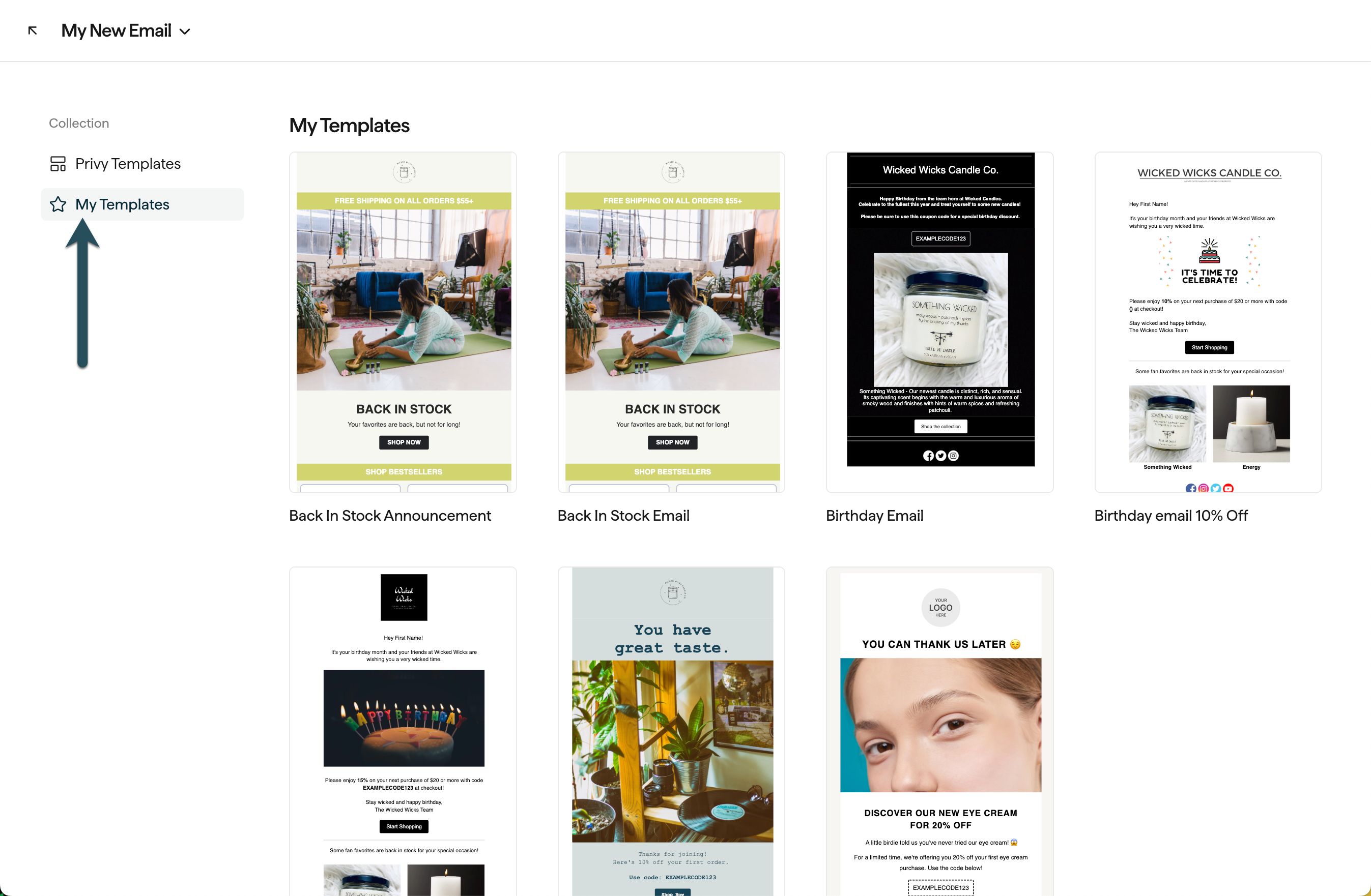 Privy offers a number of basic and stylized email templates that you can start with. To select a template, click Template at the top of your editor and select Change template from the dropdown menu. Browse between Privy’s Templates and your own saved Templates. Click on the template you’d like to use and confirm your decision.Edit the email’s styles